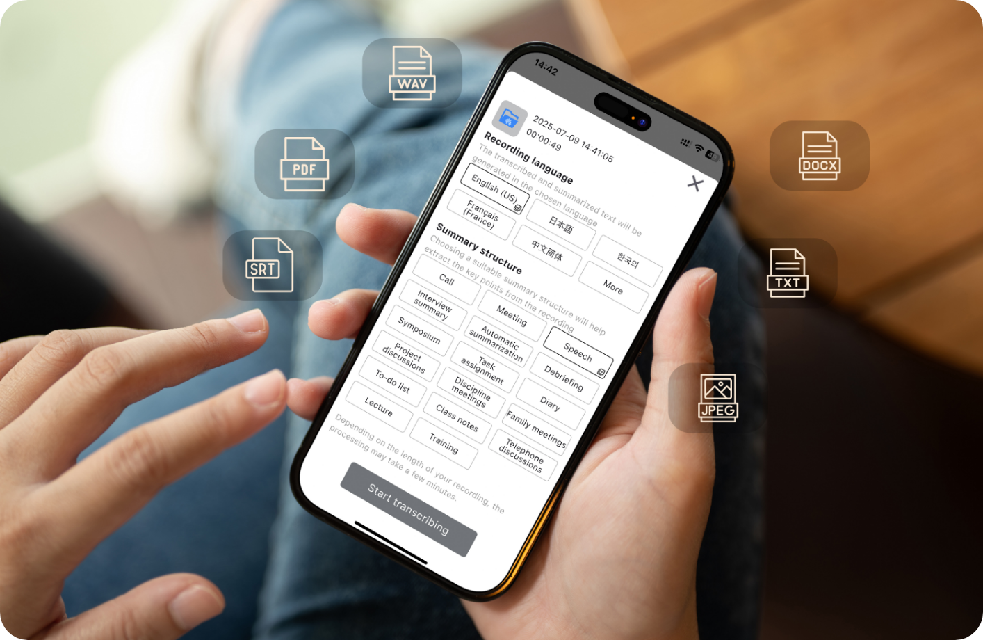 The GPT-4.1 powered transcription engine supports 140 languages including various dialects and accents. The AI system is trained on extensive multilingual data, accurately recognizing different regional English accents, Chinese dialects, etc. For professional terminology and industry vocabulary, the system continuously learns and optimizes. Users can manually correct transcriptions, and the system learns to improve future accuracy.