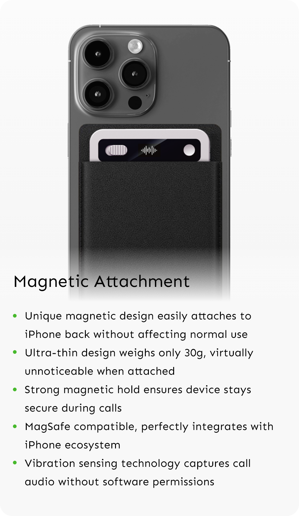 UMEVO Note Plus features ultra-thin design weighing only 30g, virtually unnoticeable when attached. The magnetic design doesn't interfere with iPhone signal reception, wireless charging, or other functions. The device connects via low-power Bluetooth and won't significantly impact iPhone battery life. Phone cases can be used normally and it supports the MagSafe ecosystem.