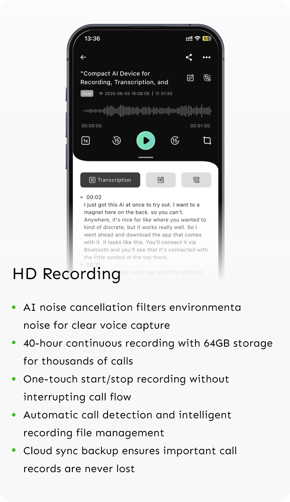 The device supports 40 hours of continuous recording with 64GB storage for thousands of calls. Automatic cloud sync ensures sufficient storage space, and intelligent file management automatically categorizes by contact, date, and importance. Supports batch export and archiving with regular cleanup features for storage management. Long calls are automatically segmented for easy searching and processing.