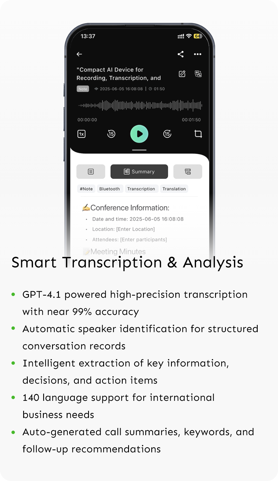 We use military-grade end-to-end encryption to protect all recording data. Recording files are encrypted on the device, with full encryption protection during transmission and storage. Users have complete control over data access permissions, supporting local storage and private cloud backup. All data processing occurs under user authorization and is never accessed by third parties or used for other purposes.
