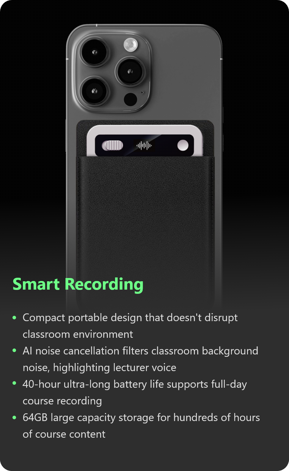 The 400mAh battery supports 40 hours of continuous recording with 60 days of standby time. It can easily handle full-day courses, multi-day seminars, or intensive training sessions. The 64GB storage space can save hundreds of hours of course recordings, meeting an entire semester's learning requirements.